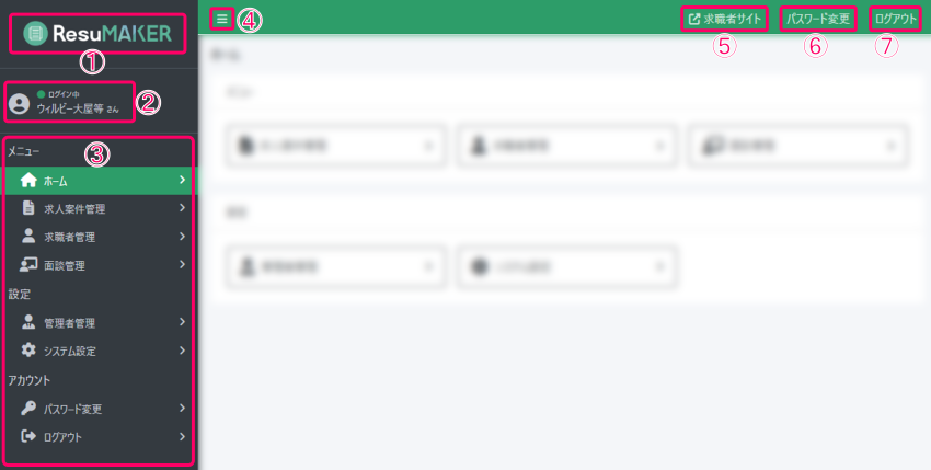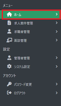 画面左側のメニューの「ホーム」を選択することでもホーム画面が表示されます。