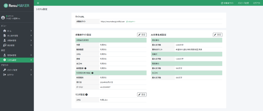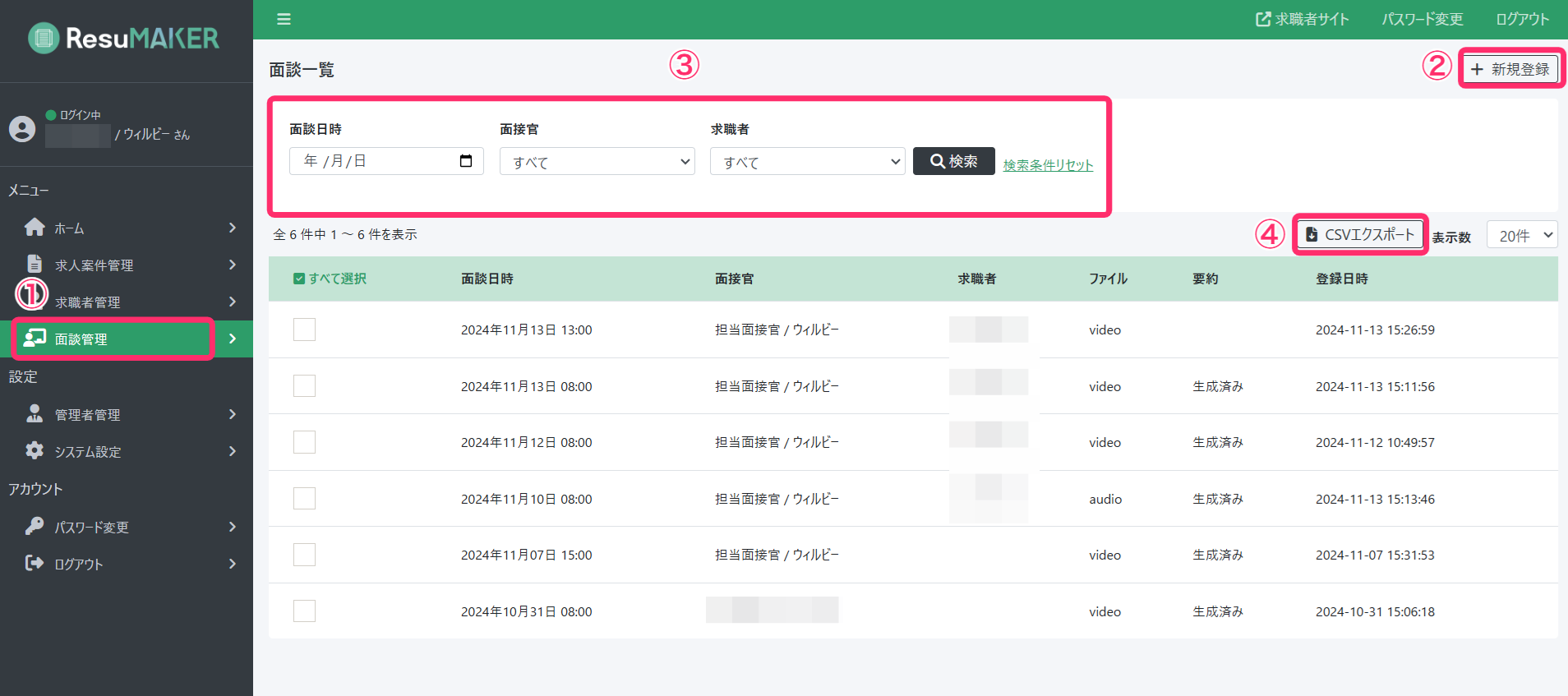登録されている求職者情報のCSVエクスポートなどの機能があります。