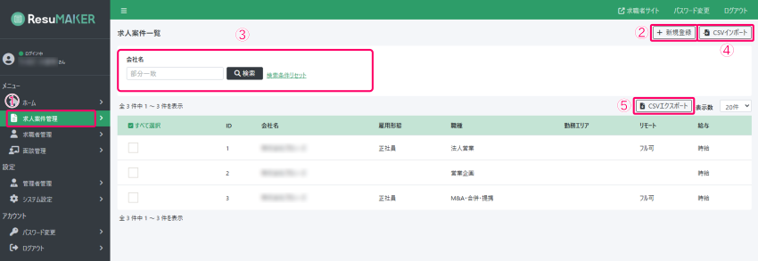 会社名から求人情報の検索表示、登録されている求人情報のCSVエクスポートなどの機能があります。