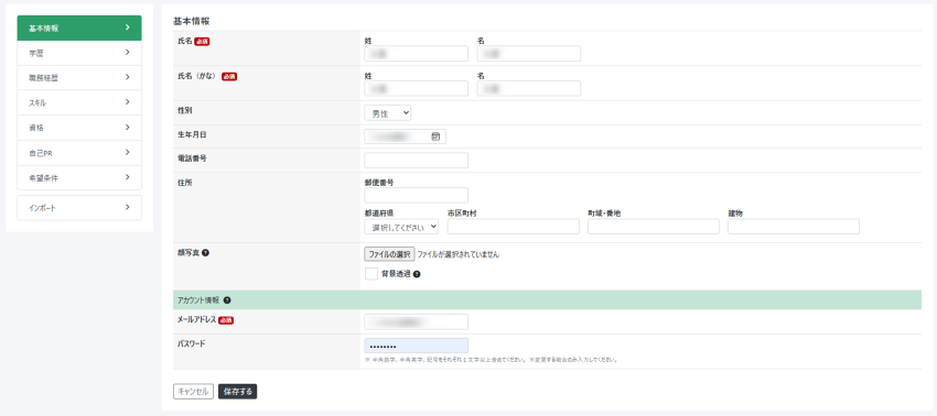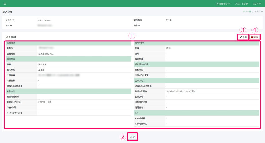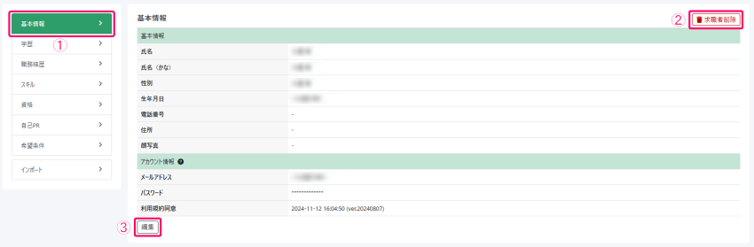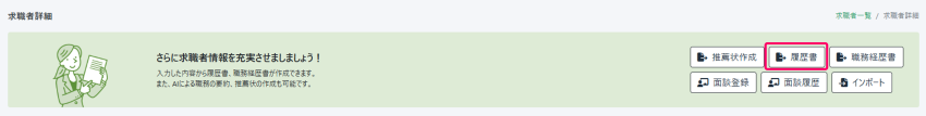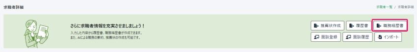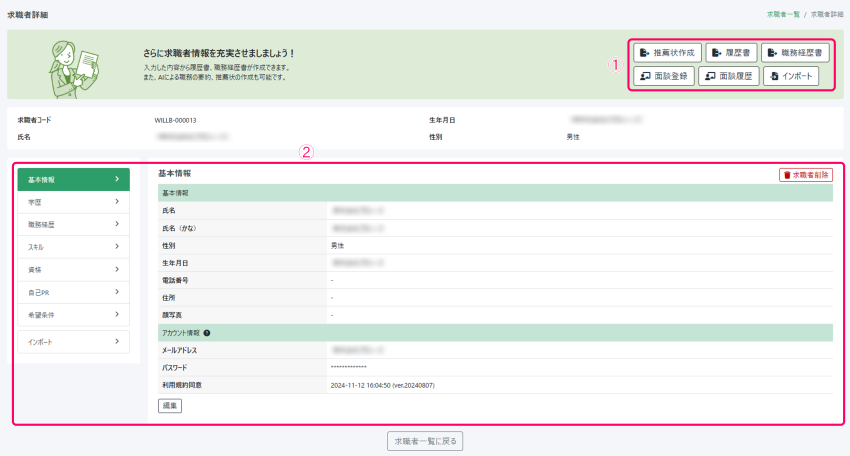 一覧の求職者情報を選択すると求職者詳細画面が表示されます。