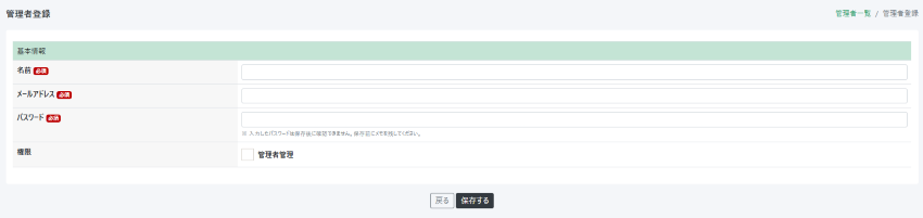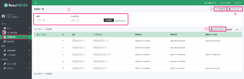 新規登録、CSVインポート、名前とメールアドレスから求職者情報の検索表示、
