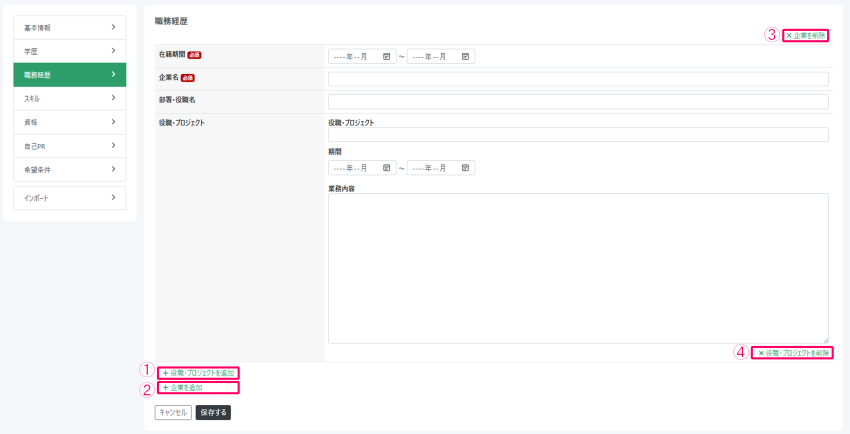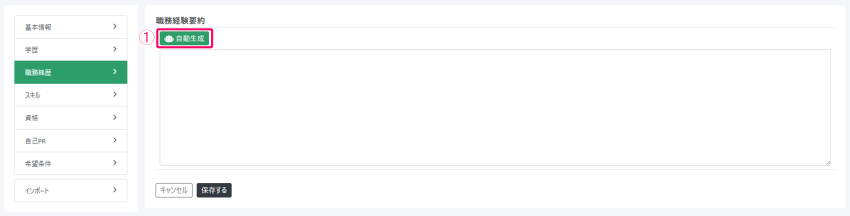 「キャンセル」ボタンは生成した内容を保存せず、職務経歴の表示に戻ります。
