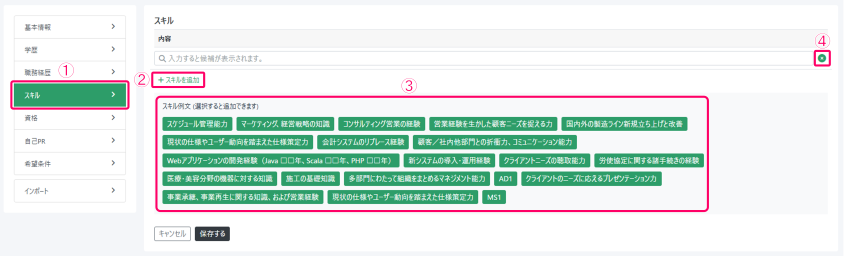 1.スキルが保存されていない場合、スキルの項目をクリックすると表示されます。