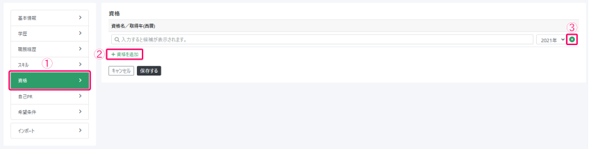 クリックすると「資格名/取得年(西暦)」の入力欄が削除されます。