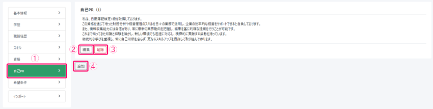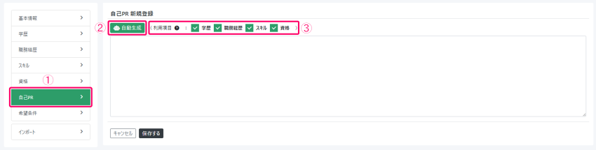 1.自己PRが保存されていない場合、自己PRの項目をクリックすると表示されます。
