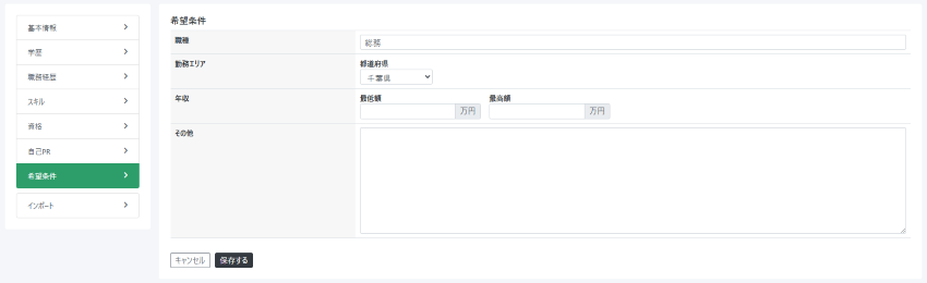「キャンセル」ボタンは入力した内容を保存せず、希望条件の表示に戻ります。
