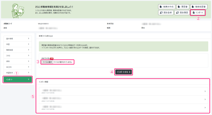 求職者詳細の履歴書や職務経歴書のPDFファイルをインポートします。