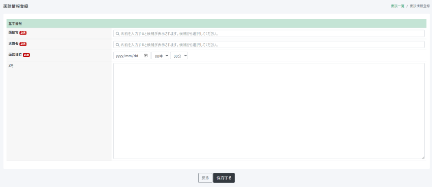 求職者詳細の「面談登録」ボタンをクリックすると面談登録画面を表示します。