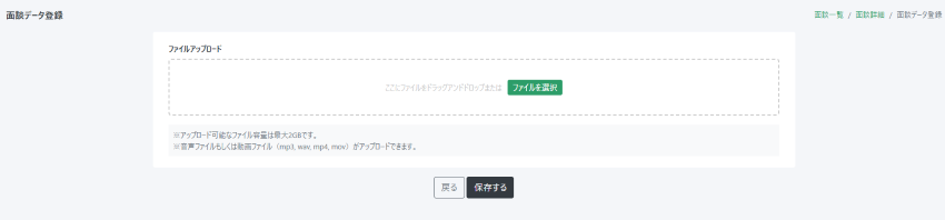 クリックすると面談データ登録の音声ファイルまた動画ファイルのアップロード画面が表示されます。