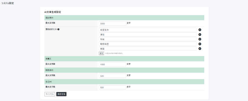 面談要約の設定についてはシステム設定の「AI文章生成設定」を参照ください。
